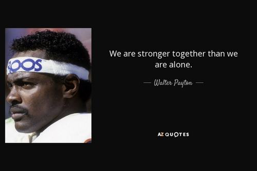 Peyton, who played for the Chicago Bears for 13 years, left a lasting impact on his team and on the NFL. Above the Bears’ locker is this quote by Walter Peyton: “We are stronger together than we are alone.”[1]